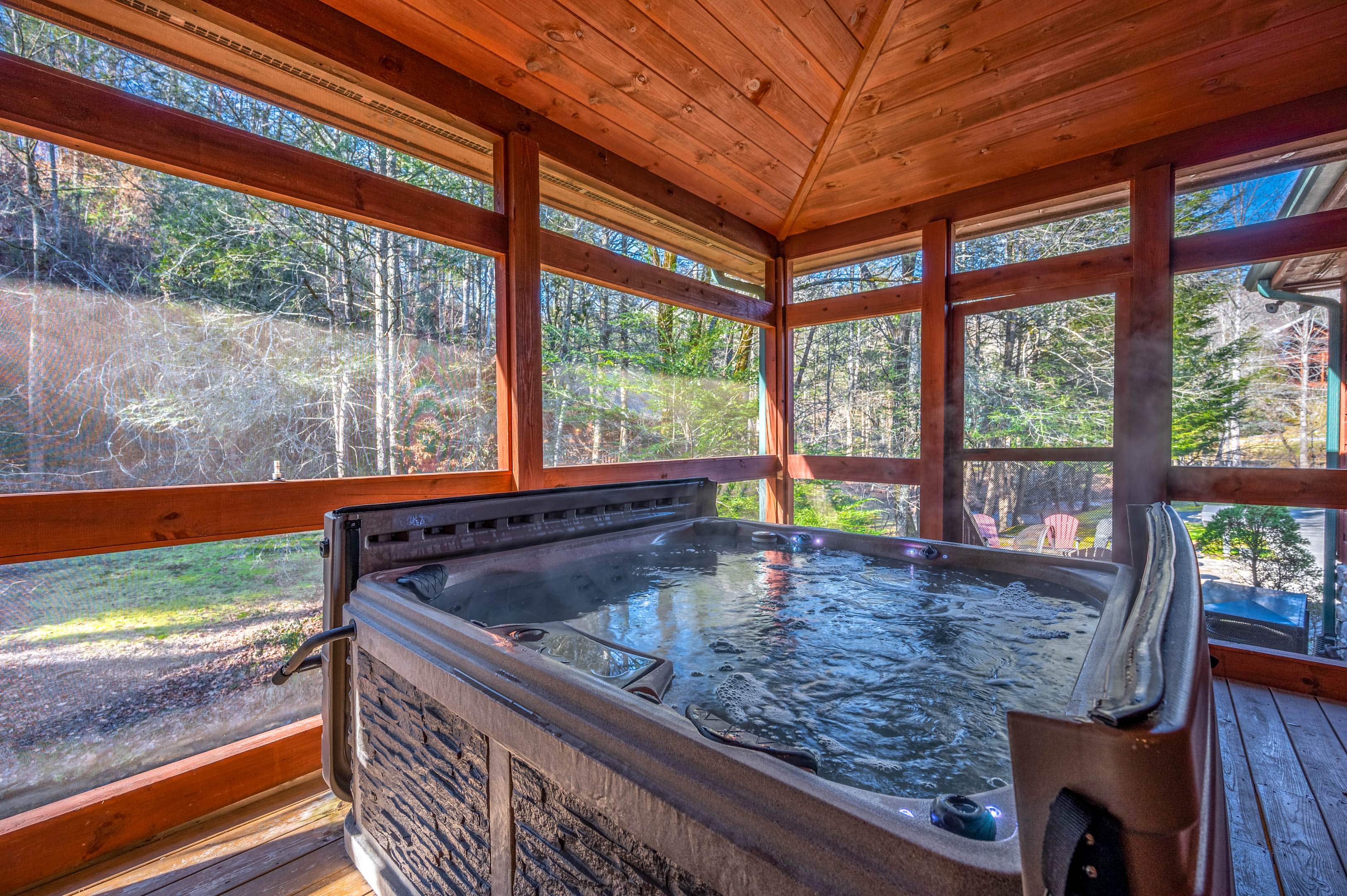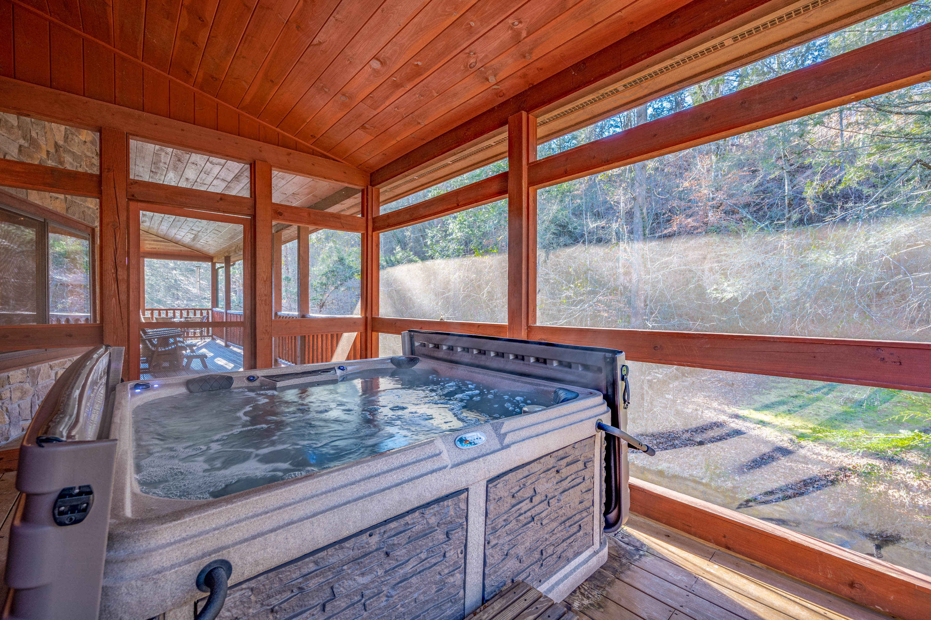 Brookside Cabin, nestled in the picturesque Cedar Falls Resort, offers a luxurious retreat in the Smoky Mountains with convenient access to Pigeon Forge and Gatlinburg attractions. Featuring elegant furnishings, a gourmet kitchen with black granite countertops, and a screened-in porch with a hot tub, this cabin combines comfort and style. Guests can unwind by the creek, enjoy a fire pit, or relax by the resort's swimming pool. With modern amenities, a spacious game room, and sumptuous bedding for restful nights, Brookside Cabin promises a memorable getaway amidst nature's beauty. Book your stay today for an unforgettable experience!