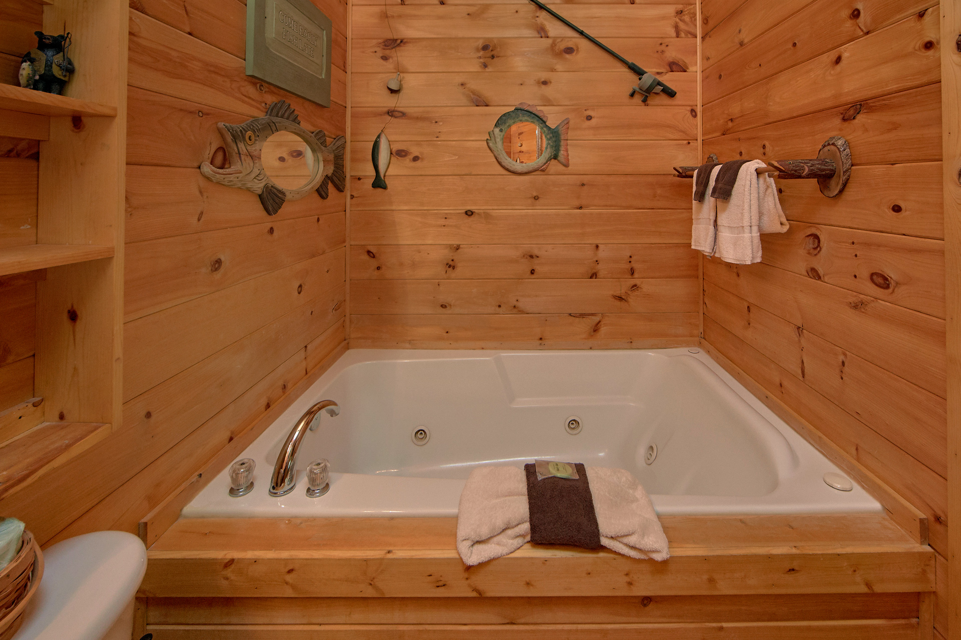Hannah B. - 05/30/2022Husband and I came with our 3 children, 7, 4, and 7months. House was immaculate and had a perfect set up for us. Hosts were easy to work with and responsive. There is a pond to fish, but it's down the road and not very accessible outside of the "no trespassing" signs from the other rentals. The picture shows a two level cabin but guests have access to the main level, not the lower. It's 5mins from Pigeon Forge and about 25mins from Gainburg. We loved being just outside of the hustle of the main areas. Really enjoyed the deck with the four rocking chairs overlooking the trees. Would recommend this cabin!