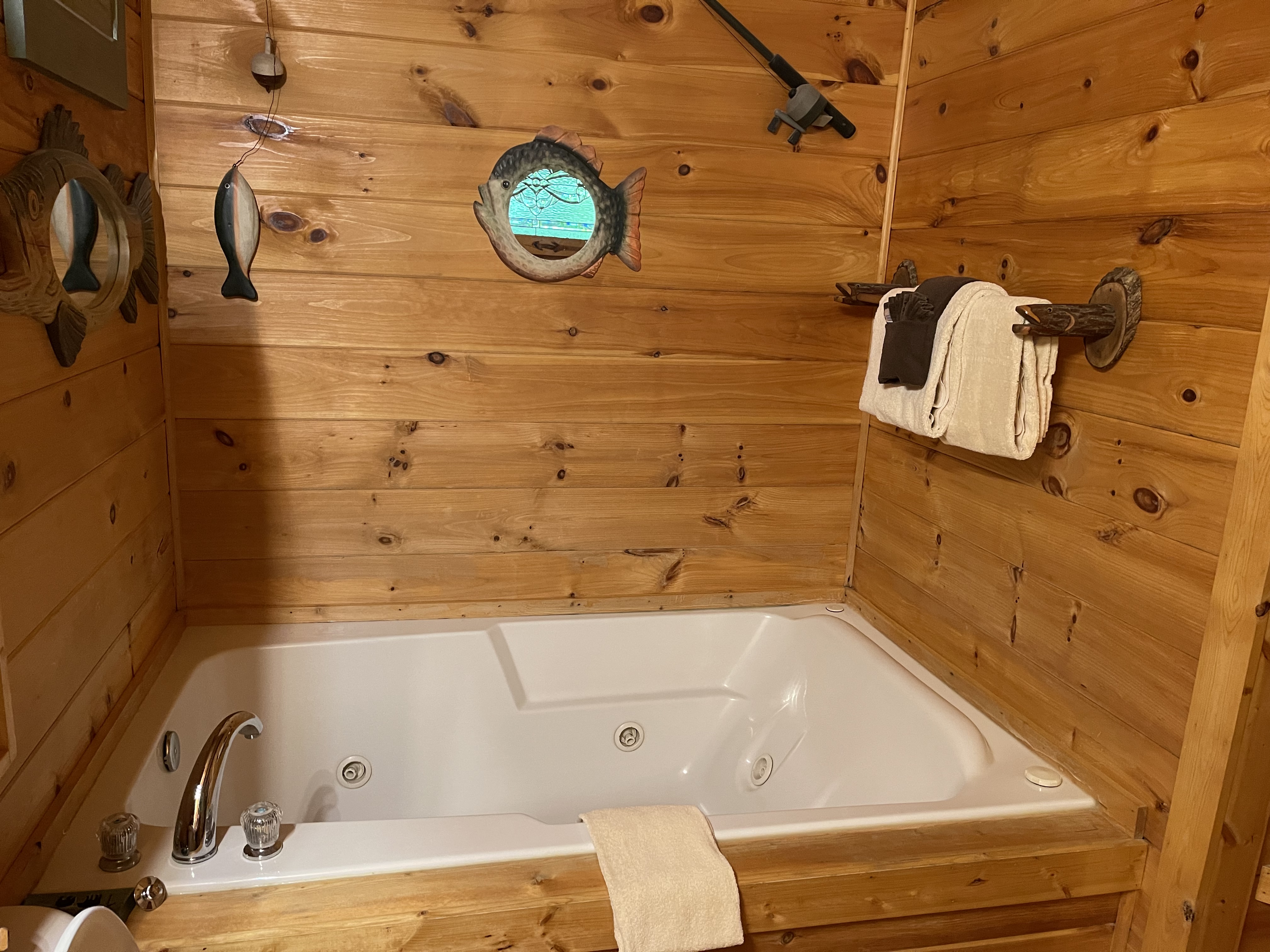 Teresa R - 03/12/2022We had a great time at the cabin. It was a great location with lots to do. We specifically chose this cabin because of the fishing pond. My 3 boys fished until it got too dark every night. They caught lots of bluegills and had a blast. We also loved the hot tub. We had a couple questions for the owners and they got back to us right away. The only thing I wish we had was maybe some information at the house on good pizza, best mini golf, best authentic southern cooking, etc. We did a pink jeep tour and our guide gave us all of that information and it was a little too late as that was our last day. Overall, great trip!