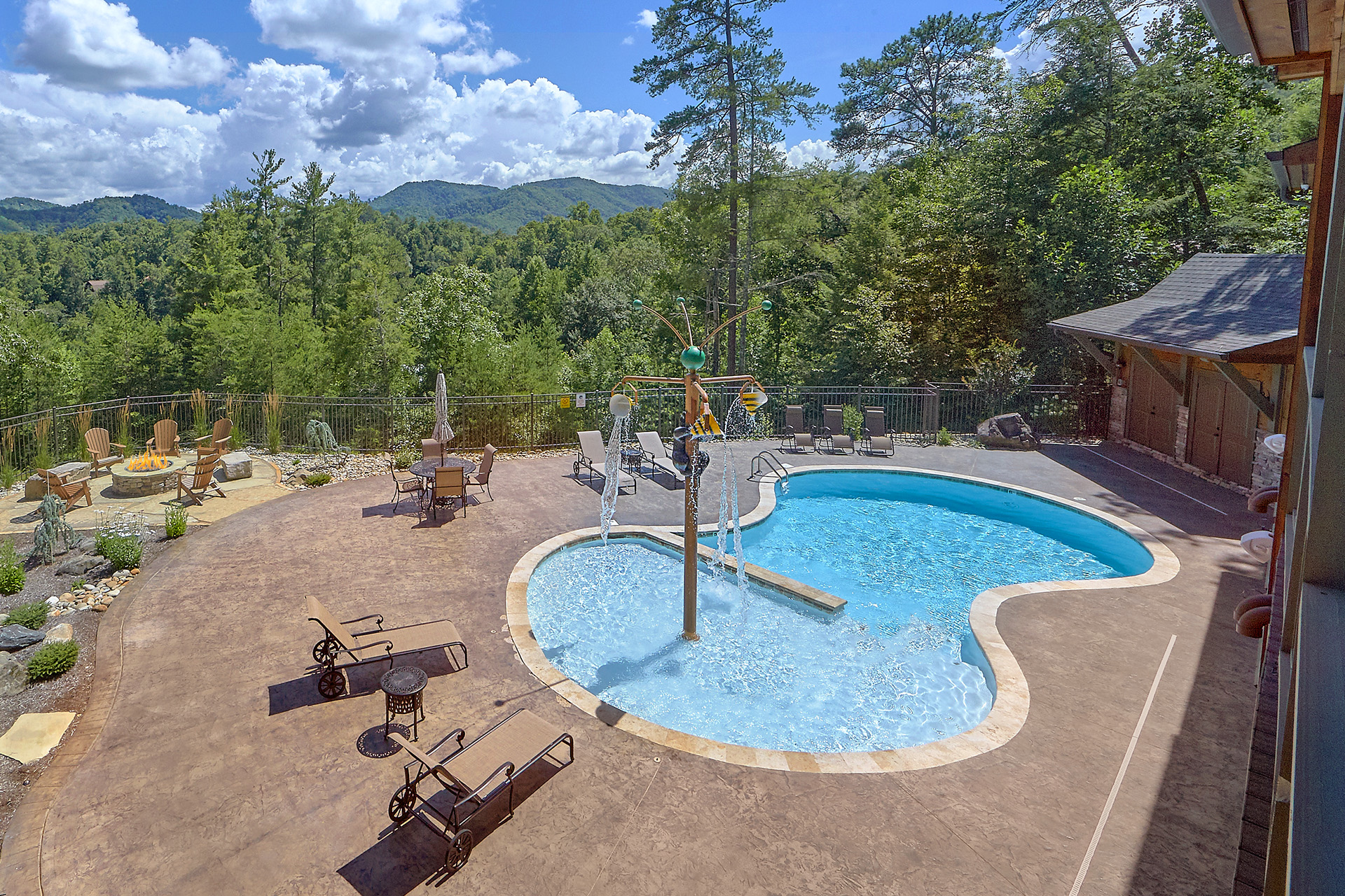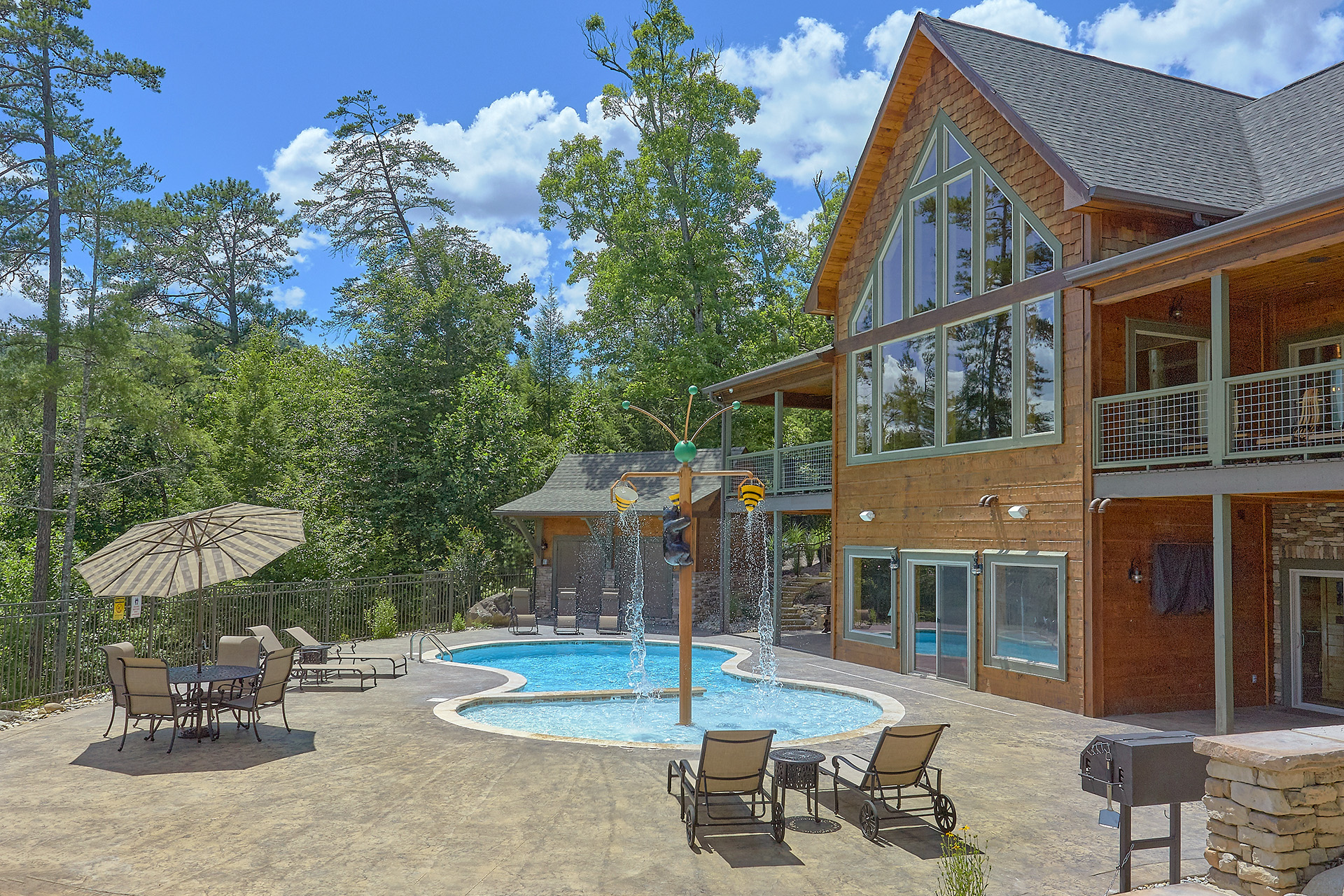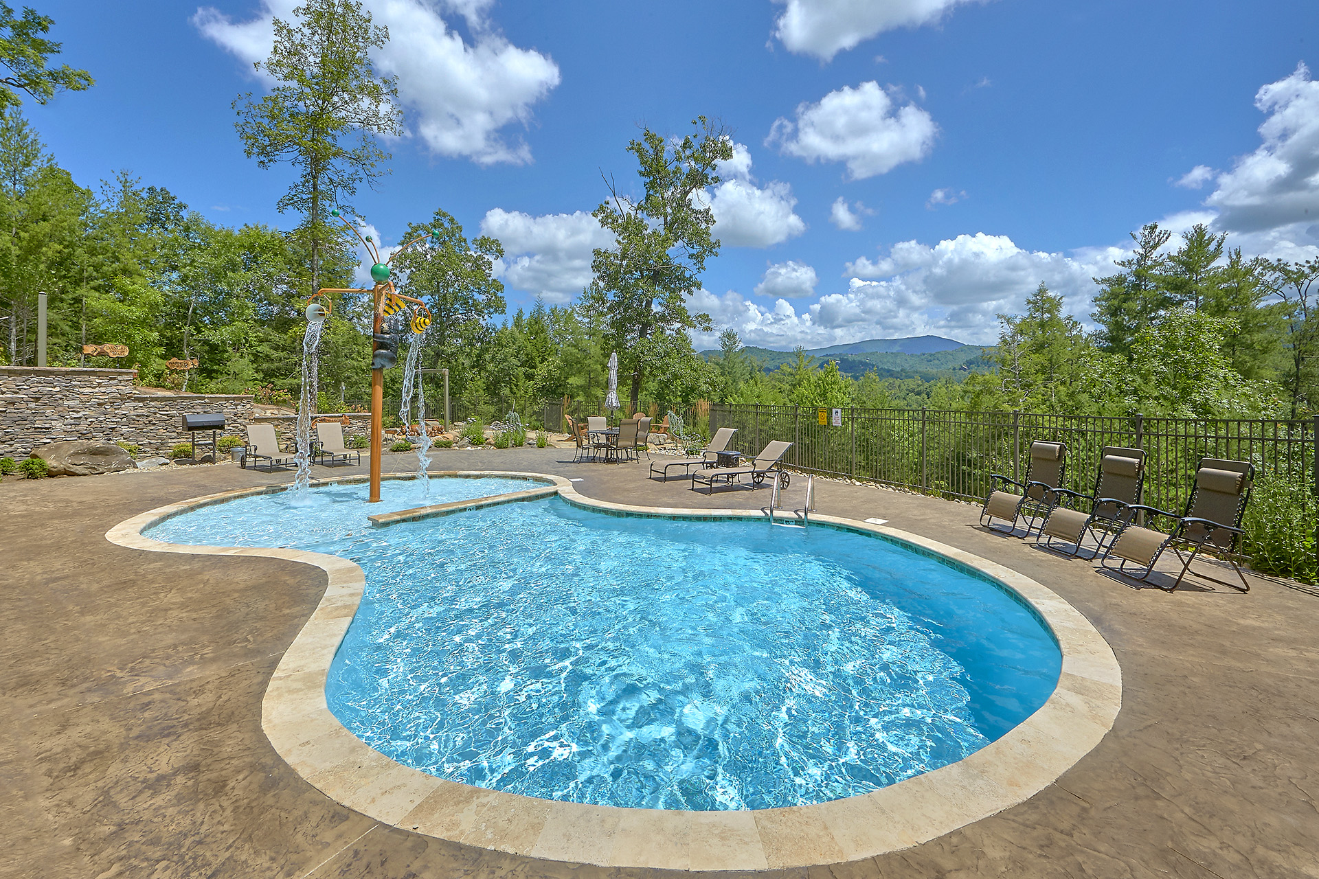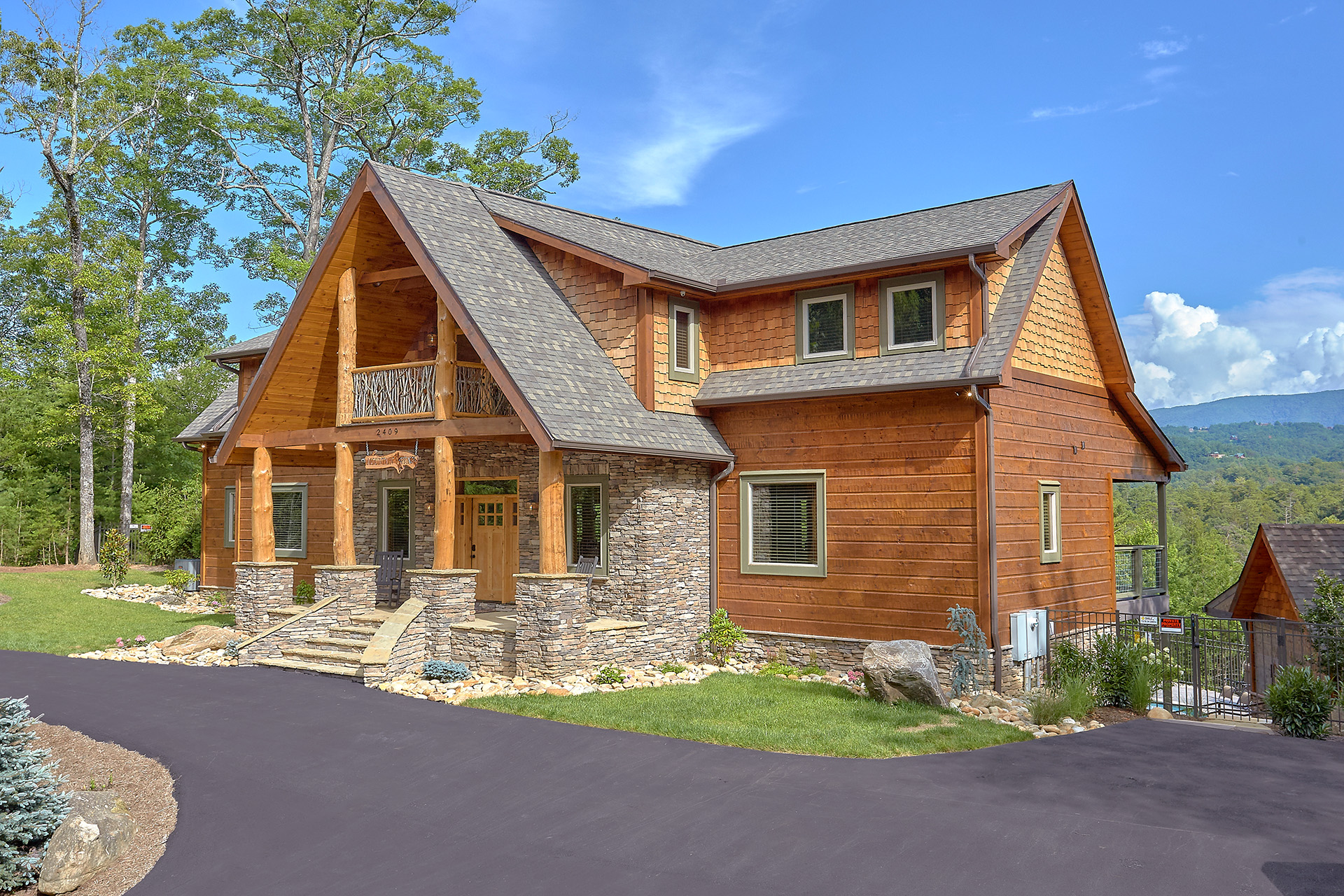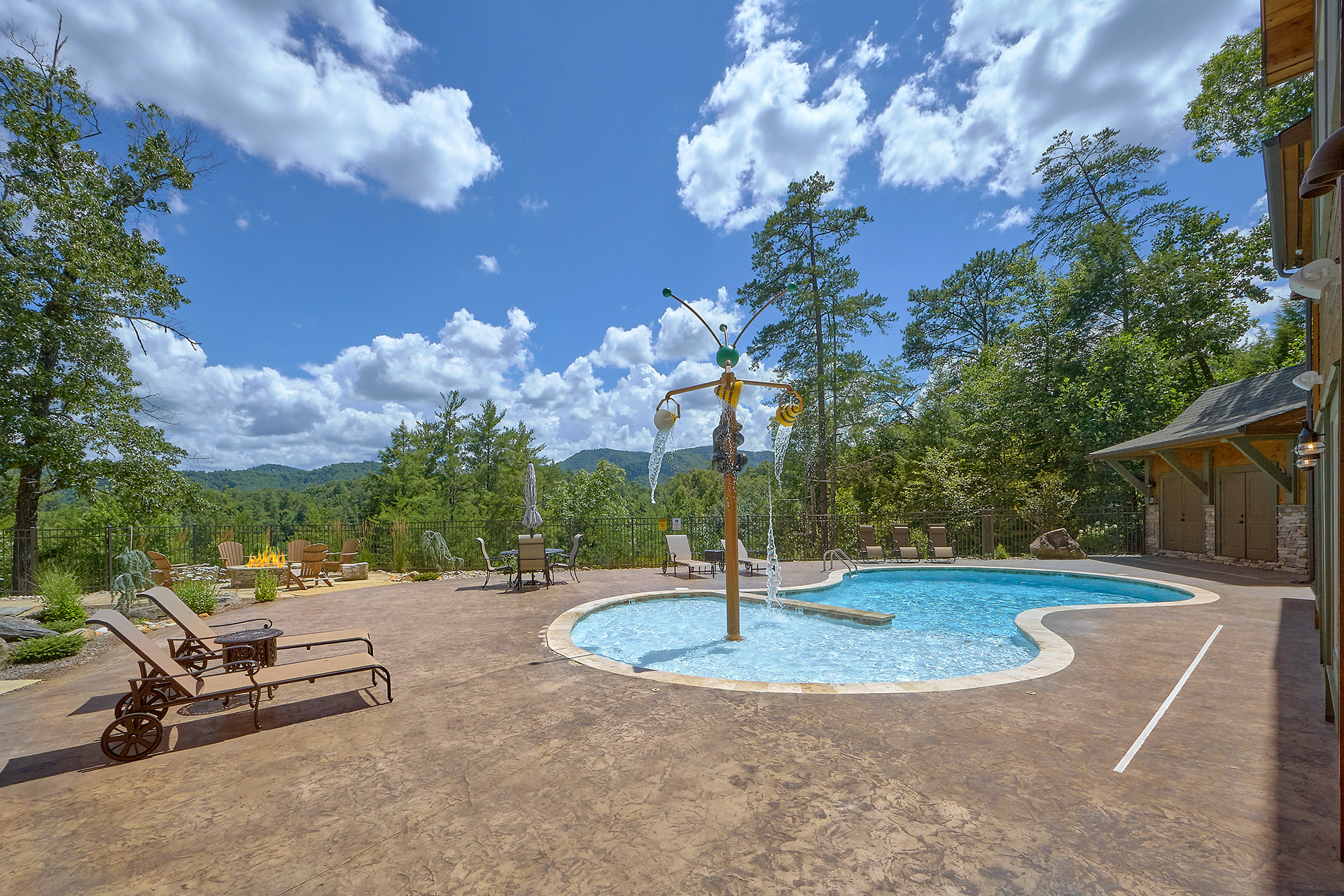 Just minutes from Pigeon Forge, located in Cedar Falls Resort, Mountain Springs is a spacious and gorgeous, 5 bedroom, 5 full and 3 half bath cabin with stunning views of the Great Smoky Mountains. The property has a private outdoor heated swimming pool, childrens splash pad, basketball court, hammock station, disk swing, BBQ grill, Hot Tub, outdoor television and a gas firepit just for starters. Every detail has been considered in this beautiful cabin, constructed with natural materials, luxurious furnishings and beautiful landscaping. Mountain Springs front door opens to a high, airy great room with lots of glass, grand views of the Smokies and overlooks the magnificent outdoor space and swimming pool. In the living area, leather furnishings are grouped before a substantial stone gas fireplace, spectacular wood carvings and a wide flat screen smart television. In the kitchen, chiseled granite countertops set off the streamlined, natural wood cabinetry. High-end appliances aim to make meal preparation easy and enjoyable. An extra wine fridge makes for plenty of cold space. Steps away, the custom crafted dining table seats eight with another six seats at the bar. Mountain Springs has five quiet, airy master bedrooms, each with its own elaborate bath, two on the main level. The master on the right as you enter the cabin is a big, sumptuous room with a fireplace, custom log furniture and large flat screen smart TV. A soft, king size bed faces the fireplace, and a door leads out to the covered porch with rockers overlooking the pool. Master bath with granite features and an oversized custom tile shower with multiple shower heads. The second bedroom on the main level is a light-filled space with a king size bed, a door to a covered porch, and a stone gas fireplace. Vast picture windows frame stunning views. As in the master bedroom, a flat-screen smart television and quality bedding offer rest and relaxation. The bath features granite counters with backlit sink basins as well. A walk-in shower, separate jacuzzi tub, and tall windows that can be shuttered for privacy. The Loft area features a half bath, unique hand crafted wet bar with seats for four, mini fridge and a one of a kind hand crafted log bar top. A regulation log finished billiard table and indoor shuffle board table just for sport. A large smart TV finishes this room so you won’t miss the big game. The first loft bedroom features aspen furnishings, plush queen bedding, stacked stone gas fireplace, large flat screen smart TV and a welcoming armchair tucked under a window. The private bath is truly over the top featuring beautiful custom cabinetry, granite tops and hammered copper sink basins. The shower is an unexpecting surprise. As you enter you’ll see a large soaking tub, two rain maker shower heads and two shower fixtures. The second loft bedroom features log furnishings, plush king bedding, stacked stone fireplace, and a flat panel smart TV. A large soaking tub sits beneath the window with shades for privacy and views of the Smokies. The private bath has a tub shower combo and ample cabinet space. No need to head to town to an arcade because there’s a fabulous game room on the lower level. This is where everyone will want to be in the evening with plenty of comfy seating, stacked stone gas fireplace and a nice sized smart TV. The many favorite arcade games in this room include Air hockey, Fast and Furious racing, Big Buck shooting game, golf, and a multicade with over 80 favorites like Ms. Packman and Donkey Kong. This room also offers a relaxing Sauna and looks out to the fabulous swimming pool. If you’re in the mood for a movie there’s a theater room just off the game room with theater seating for ten, mini fridge and microwave so bring some popcorn. You also may want to serenade your friends on the Karaoke in the theater as well. The hallway off the game room leads to a half bath and doorway leading out to the pool and a large 8 person hot tub. There’s a large outdoor TV next to the hot tub for some entertainment while you soak. The downstairs bunk room features a full log bunk bed, a King sized bed, Smart TV and a private bath. Winter months outdoor pool may not be available. NO Pets, No parties, no smoking inside or out. Our Cabin is only for responsible guest who will respect and not damage the cabin. No trailers allowed overnight in resort.
