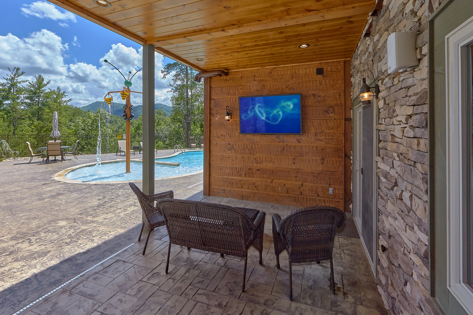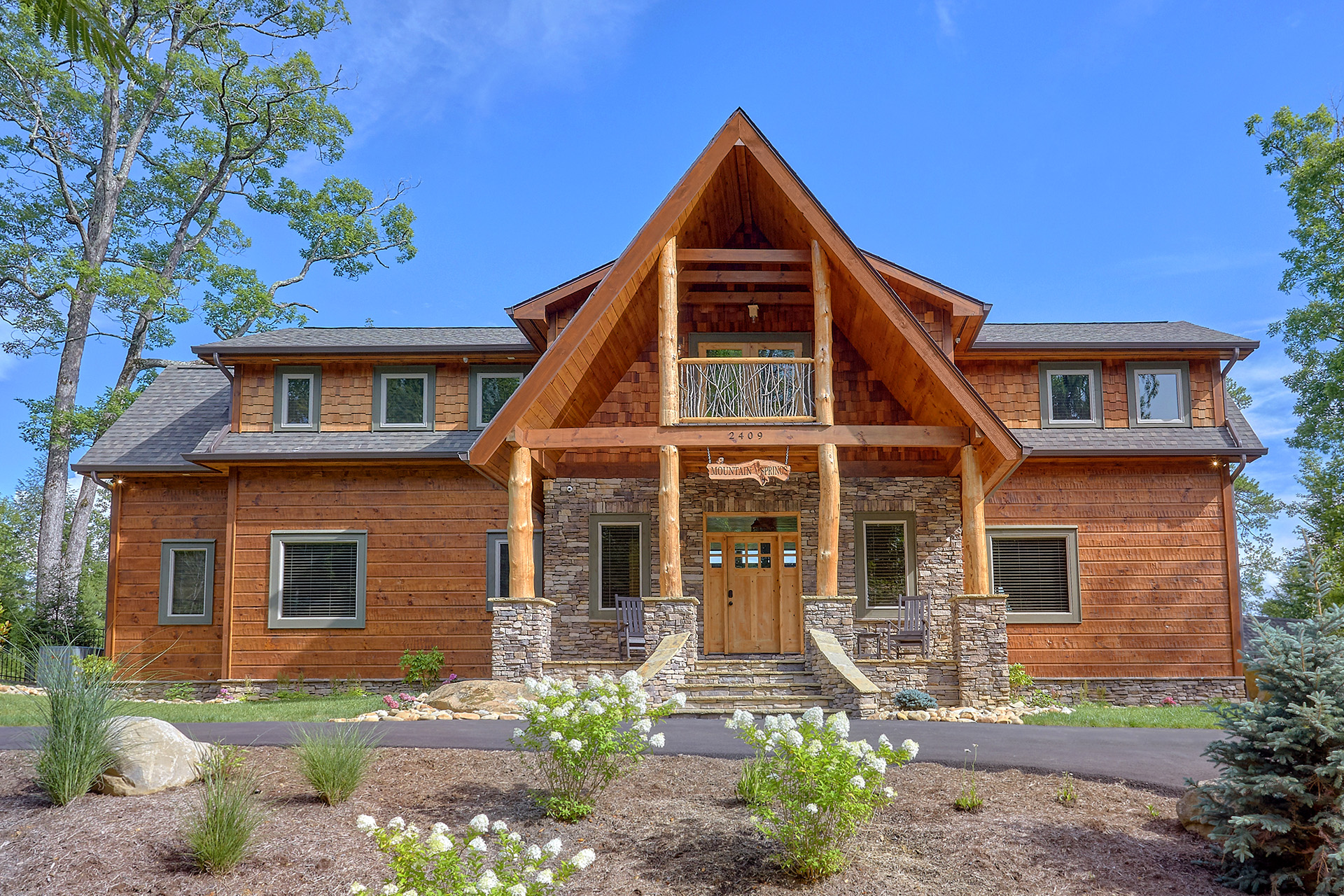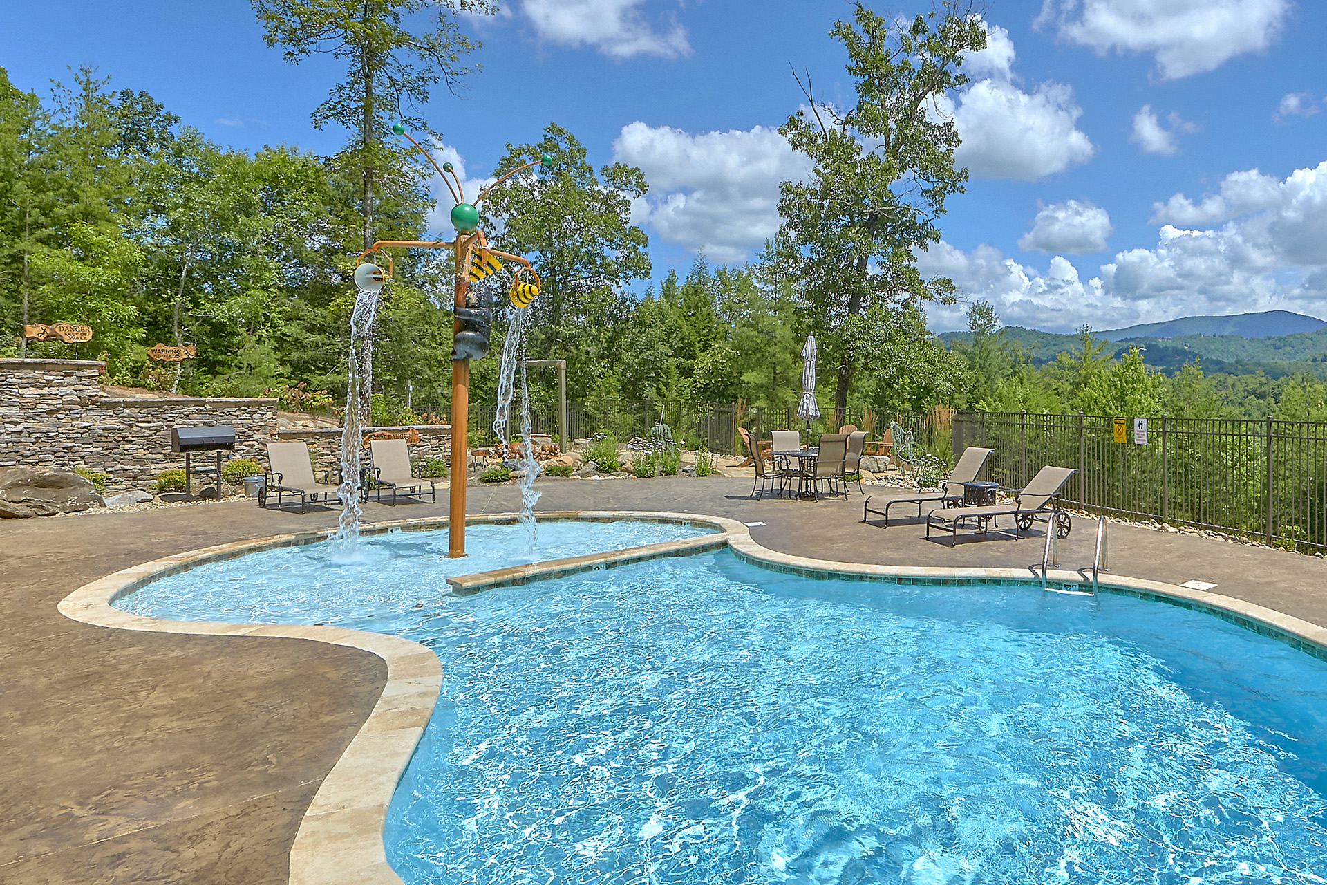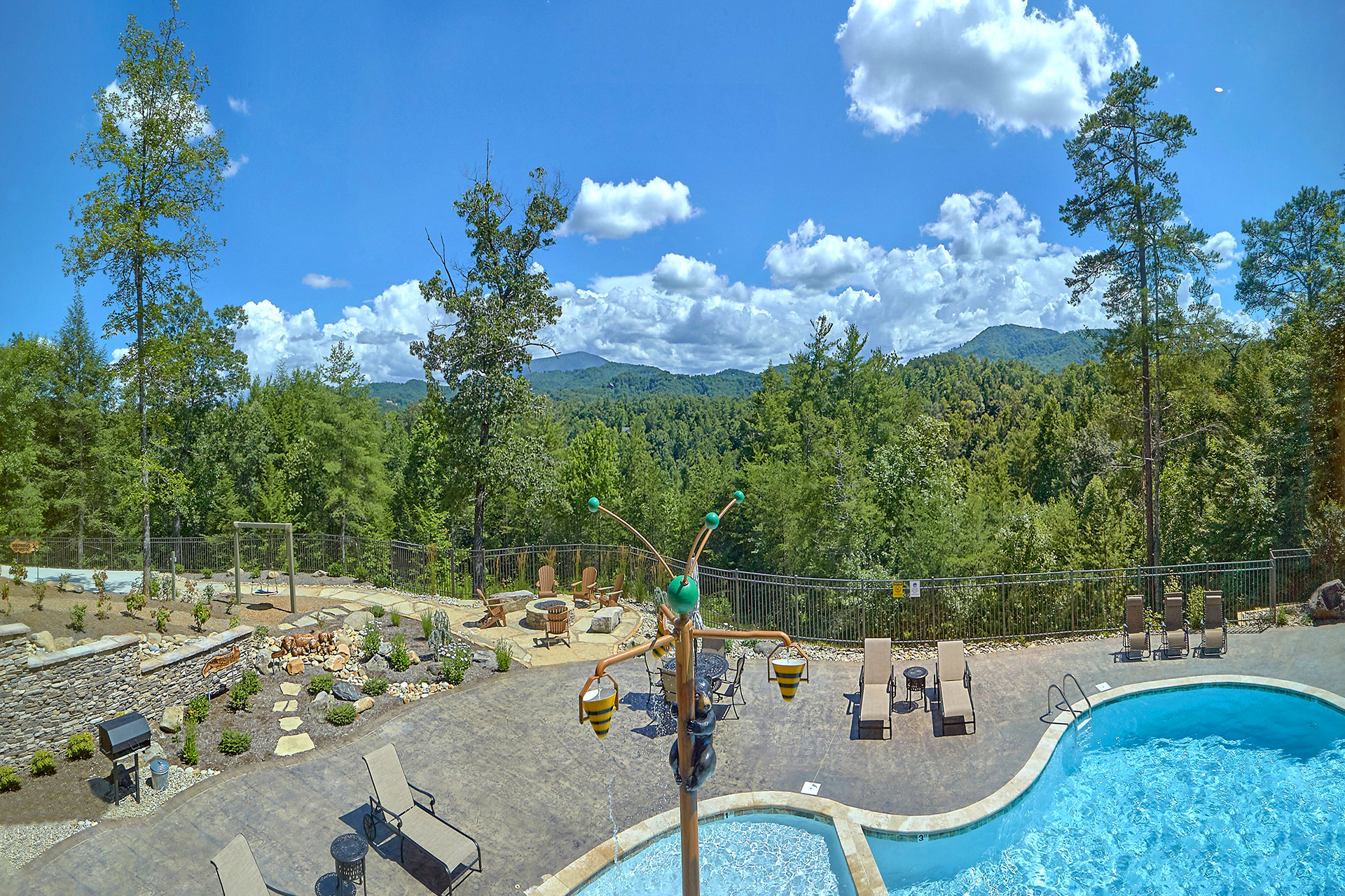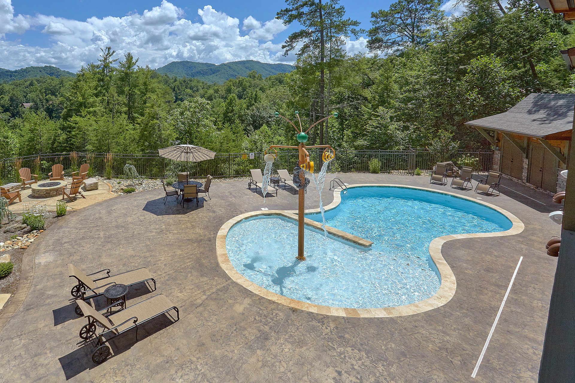 Just minutes from Pigeon Forge, located in Cedar Falls Resort, Mountain Springs is a spacious and gorgeous, 5 bedroom, 5 full and 3 half bath cabin with stunning views of the Great Smoky Mountains. The property has a private outdoor heated swimming pool, childrens splash pad, basketball court, hammock station, disk swing, BBQ grill, Hot Tub, outdoor television and a gas firepit just for starters. Every detail has been considered in this beautiful cabin, constructed with natural materials, luxurious furnishings and beautiful landscaping. Mountain Springs front door opens to a high, airy great room with lots of glass, grand views of the Smokies and overlooks the magnificent outdoor space and swimming pool. In the living area, leather furnishings are grouped before a substantial stone gas fireplace, spectacular wood carvings and a wide flat screen smart television. In the kitchen, chiseled granite countertops set off the streamlined, natural wood cabinetry. High-end appliances aim to make meal preparation easy and enjoyable. An extra wine fridge makes for plenty of cold space. Steps away, the custom crafted dining table seats eight with another six seats at the bar. Mountain Springs has five quiet, airy master bedrooms, each with its own elaborate bath, two on the main level. The master on the right as you enter the cabin is a big, sumptuous room with a fireplace, custom log furniture and large flat screen smart TV. A soft, king size bed faces the fireplace, and a door leads out to the covered porch with rockers overlooking the pool. Master bath with granite features and an oversized custom tile shower with multiple shower heads. The second bedroom on the main level is a light-filled space with a king size bed, a door to a covered porch, and a stone gas fireplace. Vast picture windows frame stunning views. As in the master bedroom, a flat-screen smart television and quality bedding offer rest and relaxation. The bath features granite counters with backlit sink basins as well. A walk-in shower, separate jacuzzi tub, and tall windows that can be shuttered for privacy. The Loft area features a half bath, unique hand crafted wet bar with seats for four, mini fridge and a one of a kind hand crafted log bar top. A regulation log finished billiard table and indoor shuffle board table just for sport. A large smart TV finishes this room so you won’t miss the big game. The first loft bedroom features aspen furnishings, plush queen bedding, stacked stone gas fireplace, large flat screen smart TV and a welcoming armchair tucked under a window. The private bath is truly over the top featuring beautiful custom cabinetry, granite tops and hammered copper sink basins. The shower is an unexpecting surprise. As you enter you’ll see a large soaking tub, two rain maker shower heads and two shower fixtures. The second loft bedroom features log furnishings, plush king bedding, stacked stone fireplace, and a flat panel smart TV. A large soaking tub sits beneath the window with shades for privacy and views of the Smokies. The private bath has a tub shower combo and ample cabinet space. No need to head to town to an arcade because there’s a fabulous game room on the lower level. This is where everyone will want to be in the evening with plenty of comfy seating, stacked stone gas fireplace and a nice sized smart TV. The many favorite arcade games in this room include Air hockey, Fast and Furious racing, Big Buck shooting game, golf, and a multicade with over 80 favorites like Ms. Packman and Donkey Kong. This room also offers a relaxing Sauna and looks out to the fabulous swimming pool. If you’re in the mood for a movie there’s a theater room just off the game room with theater seating for ten, mini fridge and microwave so bring some popcorn. You also may want to serenade your friends on the Karaoke in the theater as well. The hallway off the game room leads to a half bath and doorway leading out to the pool and a large 8 person hot tub. There’s a large outdoor TV next to the hot tub for some entertainment while you soak. The downstairs bunk room features a full log bunk bed, a King sized bed, Smart TV and a private bath. Winter months outdoor pool may not be available. NO Pets, No parties, no smoking inside or out. Our Cabin is only for responsible guest who will respect and not damage the cabin. No trailers allowed overnight in resort.