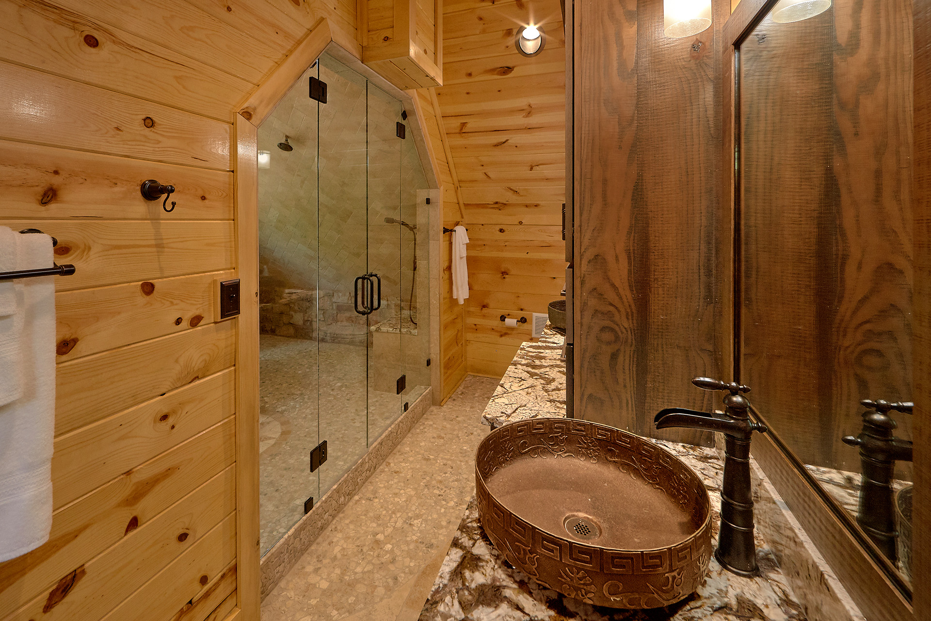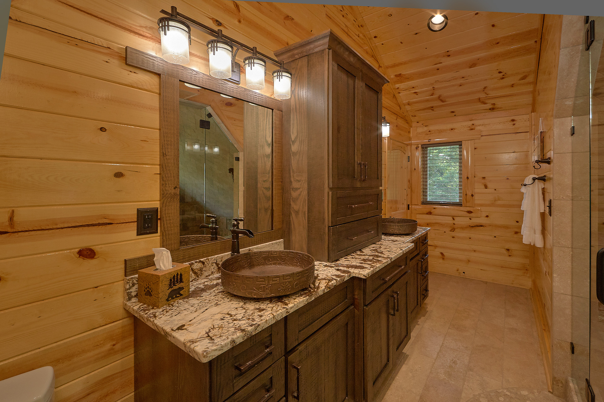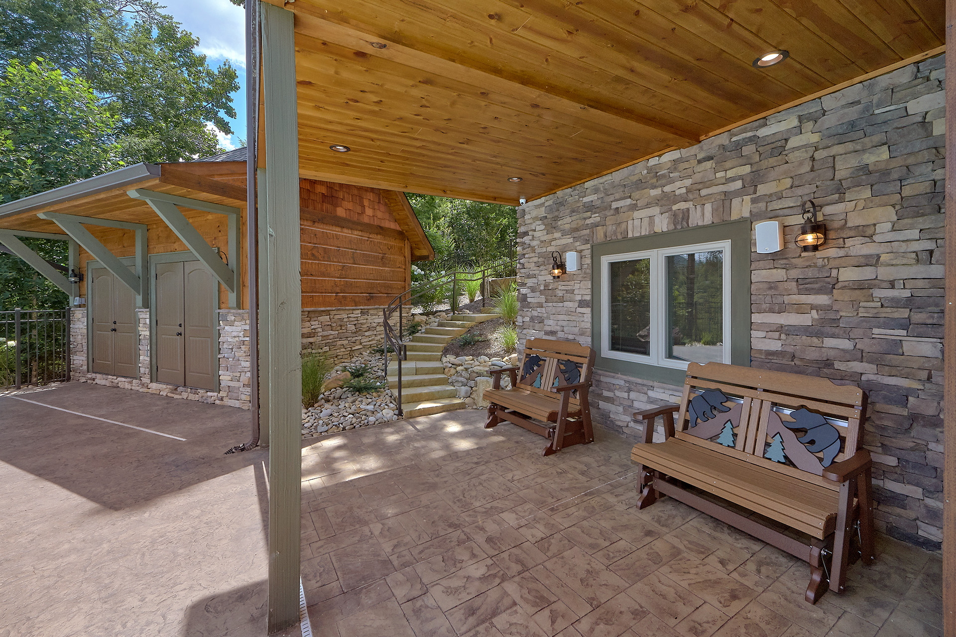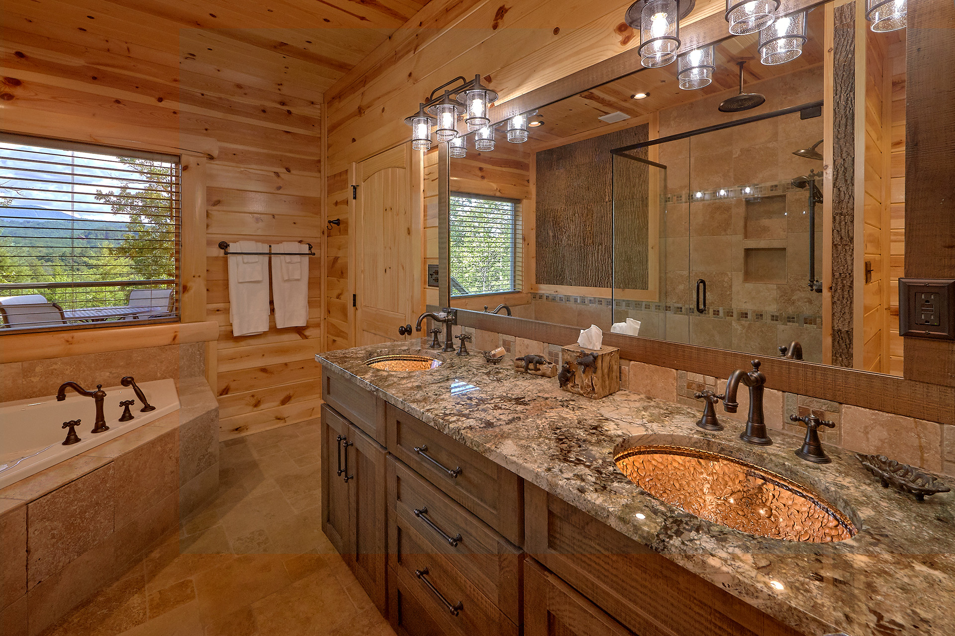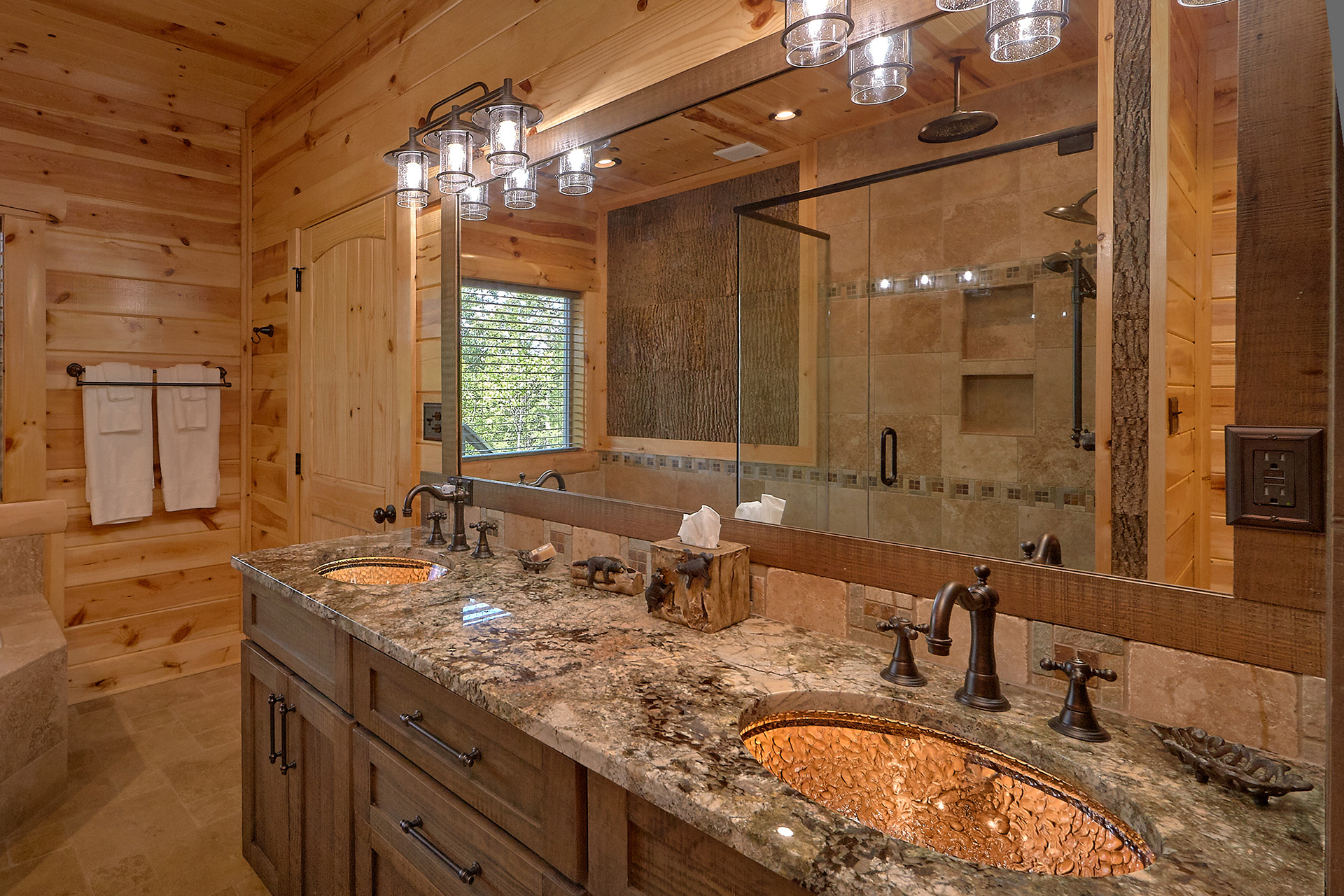 Just minutes from Pigeon Forge, located in Cedar Falls Resort, Mountain Springs is a spacious and gorgeous, 5 bedroom, 5 full and 3 half bath cabin with stunning views of the Great Smoky Mountains. The property has a private outdoor heated swimming pool, childrens splash pad, basketball court, hammock station, disk swing, BBQ grill, Hot Tub, outdoor television and a gas firepit just for starters. Every detail has been considered in this beautiful cabin, constructed with natural materials, luxurious furnishings and beautiful landscaping. Mountain Springs front door opens to a high, airy great room with lots of glass, grand views of the Smokies and overlooks the magnificent outdoor space and swimming pool. In the living area, leather furnishings are grouped before a substantial stone gas fireplace, spectacular wood carvings and a wide flat screen smart television. In the kitchen, chiseled granite countertops set off the streamlined, natural wood cabinetry. High-end appliances aim to make meal preparation easy and enjoyable. An extra wine fridge makes for plenty of cold space. Steps away, the custom crafted dining table seats eight with another six seats at the bar. Mountain Springs has five quiet, airy master bedrooms, each with its own elaborate bath, two on the main level. The master on the right as you enter the cabin is a big, sumptuous room with a fireplace, custom log furniture and large flat screen smart TV. A soft, king size bed faces the fireplace, and a door leads out to the covered porch with rockers overlooking the pool. Master bath with granite features and an oversized custom tile shower with multiple shower heads. The second bedroom on the main level is a light-filled space with a king size bed, a door to a covered porch, and a stone gas fireplace. Vast picture windows frame stunning views. As in the master bedroom, a flat-screen smart television and quality bedding offer rest and relaxation. The bath features granite counters with backlit sink basins as well. A walk-in shower, separate jacuzzi tub, and tall windows that can be shuttered for privacy. The Loft area features a half bath, unique hand crafted wet bar with seats for four, mini fridge and a one of a kind hand crafted log bar top. A regulation log finished billiard table and indoor shuffle board table just for sport. A large smart TV finishes this room so you won’t miss the big game. The first loft bedroom features aspen furnishings, plush queen bedding, stacked stone gas fireplace, large flat screen smart TV and a welcoming armchair tucked under a window. The private bath is truly over the top featuring beautiful custom cabinetry, granite tops and hammered copper sink basins. The shower is an unexpecting surprise. As you enter you’ll see a large soaking tub, two rain maker shower heads and two shower fixtures. The second loft bedroom features log furnishings, plush king bedding, stacked stone fireplace, and a flat panel smart TV. A large soaking tub sits beneath the window with shades for privacy and views of the Smokies. The private bath has a tub shower combo and ample cabinet space. No need to head to town to an arcade because there’s a fabulous game room on the lower level. This is where everyone will want to be in the evening with plenty of comfy seating, stacked stone gas fireplace and a nice sized smart TV. The many favorite arcade games in this room include Air hockey, Fast and Furious racing, Big Buck shooting game, golf, and a multicade with over 80 favorites like Ms. Packman and Donkey Kong. This room also offers a relaxing Sauna and looks out to the fabulous swimming pool. If you’re in the mood for a movie there’s a theater room just off the game room with theater seating for ten, mini fridge and microwave so bring some popcorn. You also may want to serenade your friends on the Karaoke in the theater as well. The hallway off the game room leads to a half bath and doorway leading out to the pool and a large 8 person hot tub. There’s a large outdoor TV next to the hot tub for some entertainment while you soak. The downstairs bunk room features a full log bunk bed, a King sized bed, Smart TV and a private bath. Winter months outdoor pool may not be available. NO Pets, No parties, no smoking inside or out. Our Cabin is only for responsible guest who will respect and not damage the cabin. No trailers allowed overnight in resort.