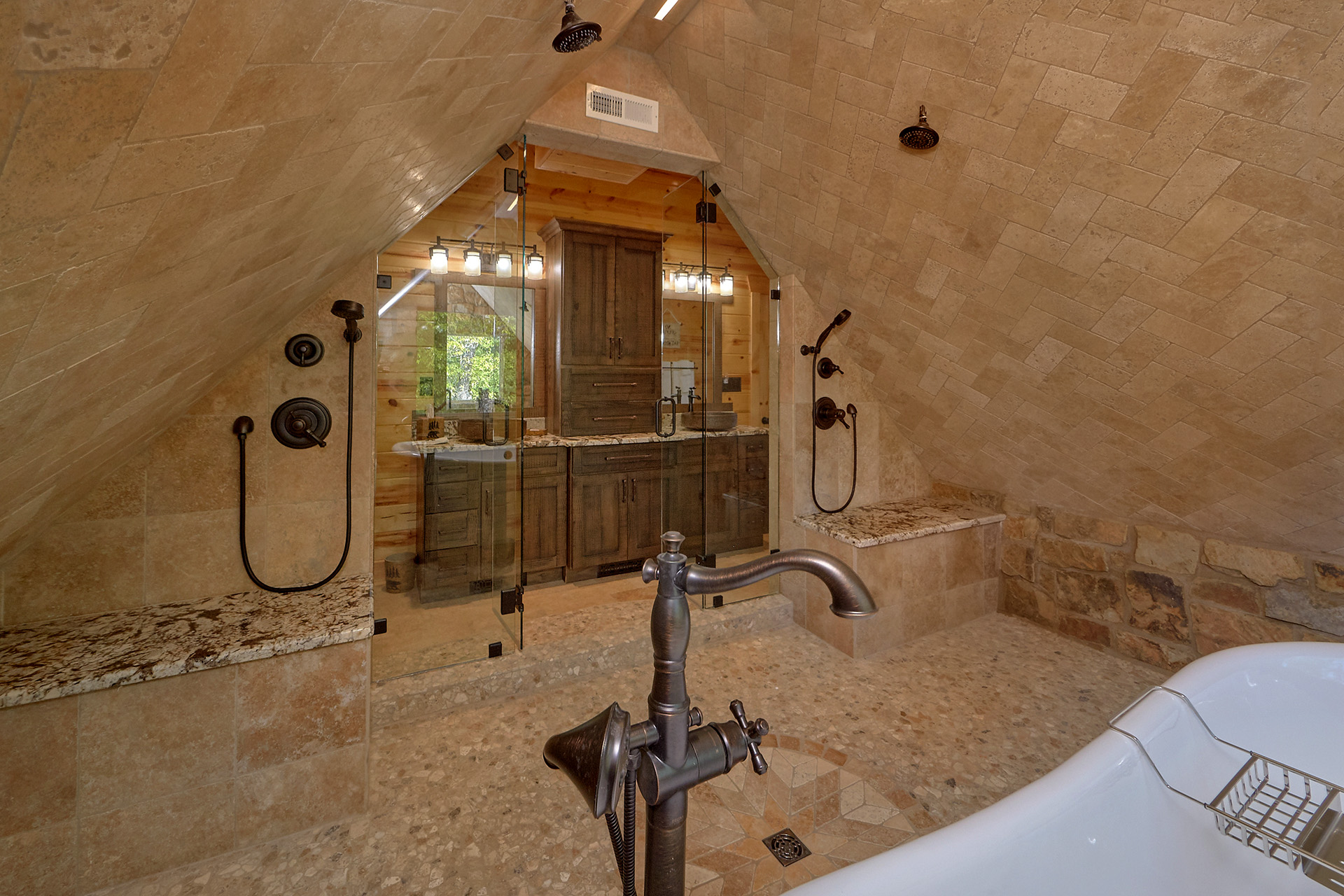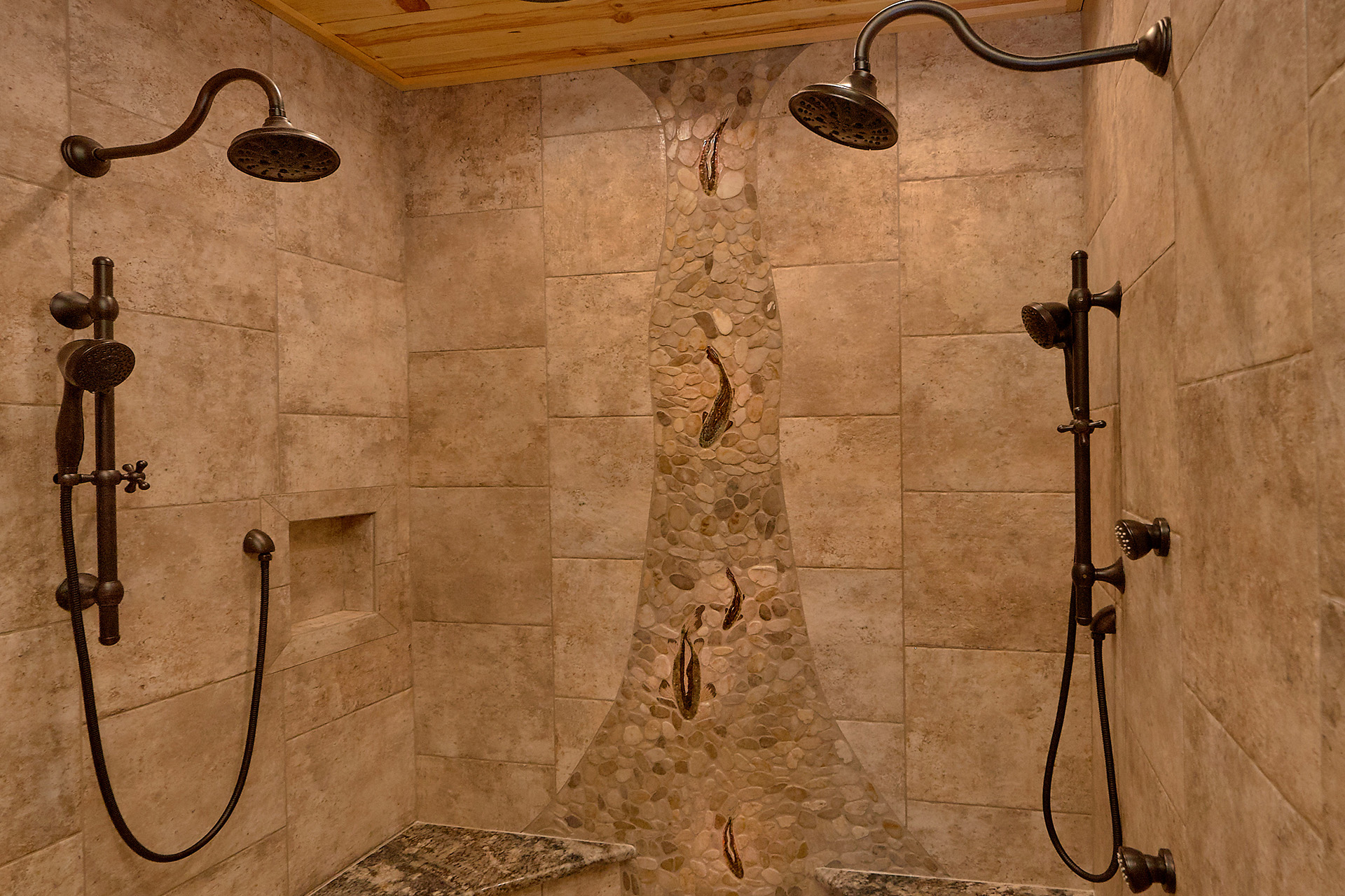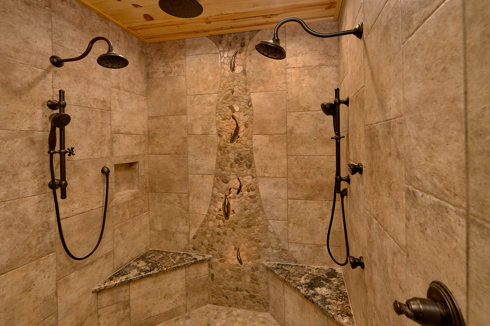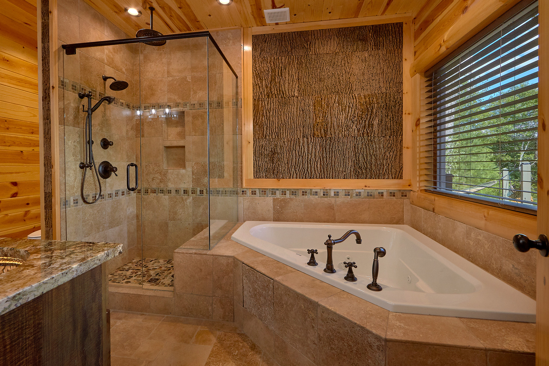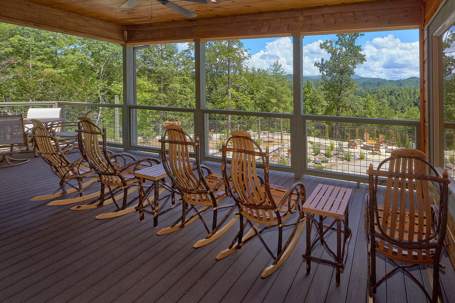 Just minutes from Pigeon Forge, located in Cedar Falls Resort, Mountain Springs is a spacious and gorgeous, 5 bedroom, 5 full and 3 half bath cabin with stunning views of the Great Smoky Mountains. The property has a private outdoor heated swimming pool, childrens splash pad, basketball court, hammock station, disk swing, BBQ grill, Hot Tub, outdoor television and a gas firepit just for starters. Every detail has been considered in this beautiful cabin, constructed with natural materials, luxurious furnishings and beautiful landscaping. Mountain Springs front door opens to a high, airy great room with lots of glass, grand views of the Smokies and overlooks the magnificent outdoor space and swimming pool. In the living area, leather furnishings are grouped before a substantial stone gas fireplace, spectacular wood carvings and a wide flat screen smart television. In the kitchen, chiseled granite countertops set off the streamlined, natural wood cabinetry. High-end appliances aim to make meal preparation easy and enjoyable. An extra wine fridge makes for plenty of cold space. Steps away, the custom crafted dining table seats eight with another six seats at the bar. Mountain Springs has five quiet, airy master bedrooms, each with its own elaborate bath, two on the main level. The master on the right as you enter the cabin is a big, sumptuous room with a fireplace, custom log furniture and large flat screen smart TV. A soft, king size bed faces the fireplace, and a door leads out to the covered porch with rockers overlooking the pool. Master bath with granite features and an oversized custom tile shower with multiple shower heads. The second bedroom on the main level is a light-filled space with a king size bed, a door to a covered porch, and a stone gas fireplace. Vast picture windows frame stunning views. As in the master bedroom, a flat-screen smart television and quality bedding offer rest and relaxation. The bath features granite counters with backlit sink basins as well. A walk-in shower, separate jacuzzi tub, and tall windows that can be shuttered for privacy. The Loft area features a half bath, unique hand crafted wet bar with seats for four, mini fridge and a one of a kind hand crafted log bar top. A regulation log finished billiard table and indoor shuffle board table just for sport. A large smart TV finishes this room so you won’t miss the big game. The first loft bedroom features aspen furnishings, plush queen bedding, stacked stone gas fireplace, large flat screen smart TV and a welcoming armchair tucked under a window. The private bath is truly over the top featuring beautiful custom cabinetry, granite tops and hammered copper sink basins. The shower is an unexpecting surprise. As you enter you’ll see a large soaking tub, two rain maker shower heads and two shower fixtures. The second loft bedroom features log furnishings, plush king bedding, stacked stone fireplace, and a flat panel smart TV. A large soaking tub sits beneath the window with shades for privacy and views of the Smokies. The private bath has a tub shower combo and ample cabinet space. No need to head to town to an arcade because there’s a fabulous game room on the lower level. This is where everyone will want to be in the evening with plenty of comfy seating, stacked stone gas fireplace and a nice sized smart TV. The many favorite arcade games in this room include Air hockey, Fast and Furious racing, Big Buck shooting game, golf, and a multicade with over 80 favorites like Ms. Packman and Donkey Kong. This room also offers a relaxing Sauna and looks out to the fabulous swimming pool. If you’re in the mood for a movie there’s a theater room just off the game room with theater seating for ten, mini fridge and microwave so bring some popcorn. You also may want to serenade your friends on the Karaoke in the theater as well. The hallway off the game room leads to a half bath and doorway leading out to the pool and a large 8 person hot tub. There’s a large outdoor TV next to the hot tub for some entertainment while you soak. The downstairs bunk room features a full log bunk bed, a King sized bed, Smart TV and a private bath. Winter months outdoor pool may not be available. NO Pets, No parties, no smoking inside or out. Our Cabin is only for responsible guest who will respect and not damage the cabin. No trailers allowed overnight in resort.