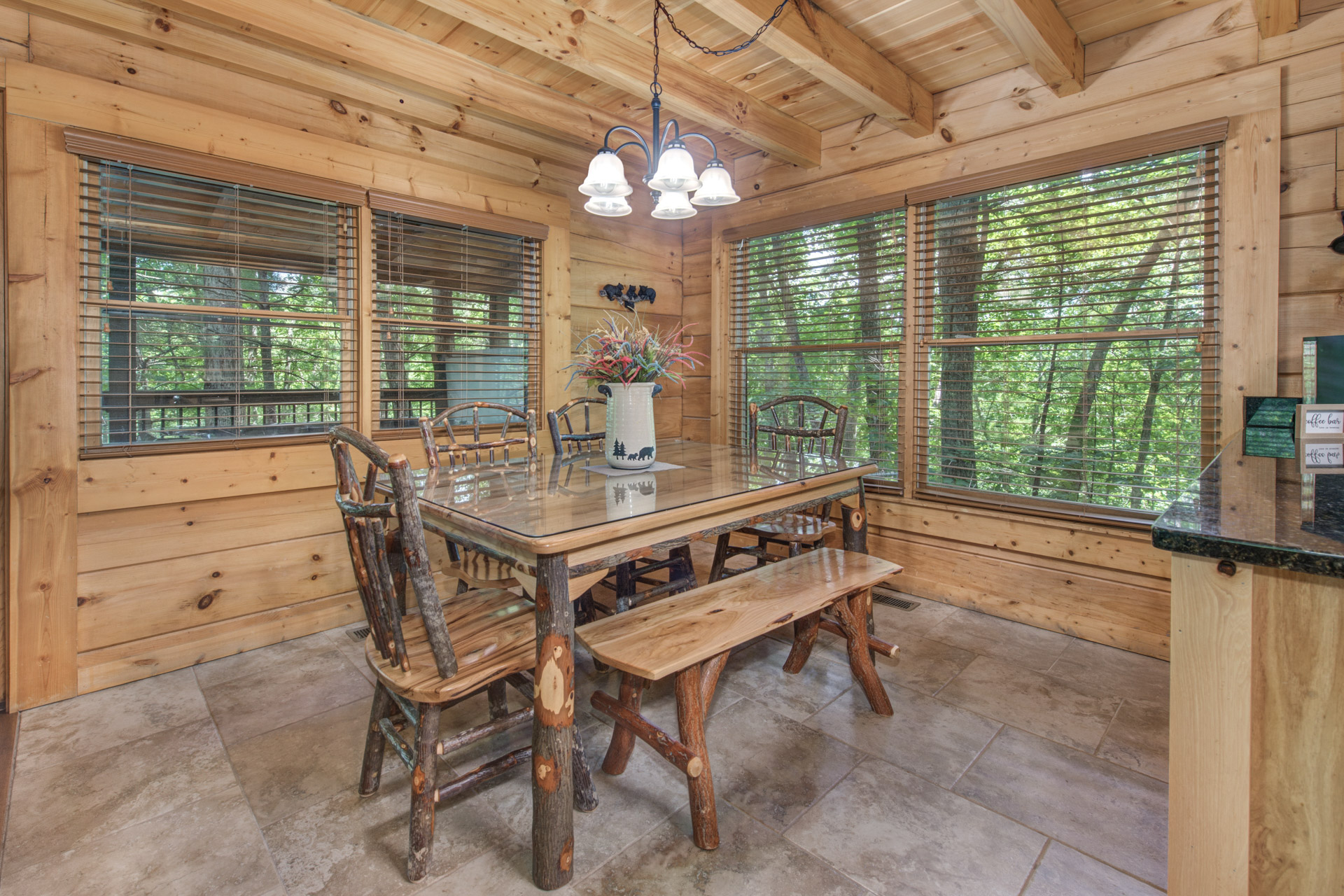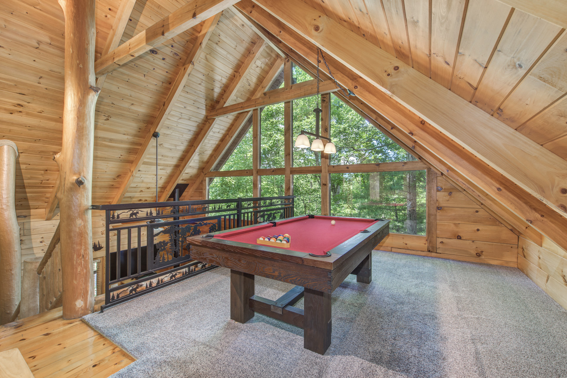 This Log cabin has lots to offer a small family or a group of friends looking for a place to get away from it all. Featuring 2 King size bedrooms, 2 full baths, a large dining and living room area, a full kitchen, a loft sitting area with pool table and video arcade game, and a 6 person hot tub. Timber Top has just enough space for privacy and together time! Other remarkable features of this cabin are a stone gas fireplace, a covered porch with rockers, a Jacuzzi tub, and a washer and dryer. This cabin is 1/2 mile from the Pigeon Forge City limits but still very convenient to the National Park, the best of both worlds. Click Dates for available Specials!